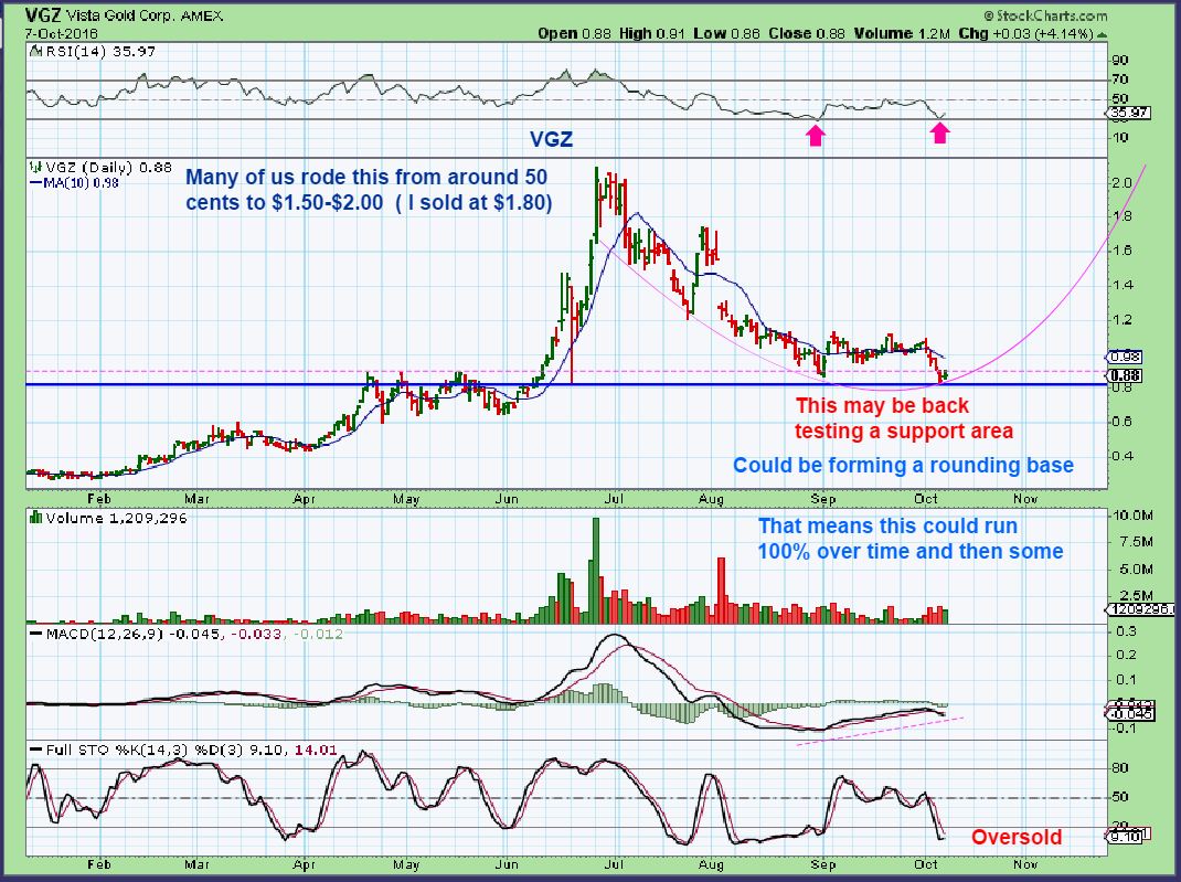 VGZ – If you have been here for a while, maybe you made huge gains on VGZ and MUX . It has corrected a lot and looks to be trying to form a round bottom base. If so, these should be the lows. This could double or triple over time just by running to former highs and breaking out.
