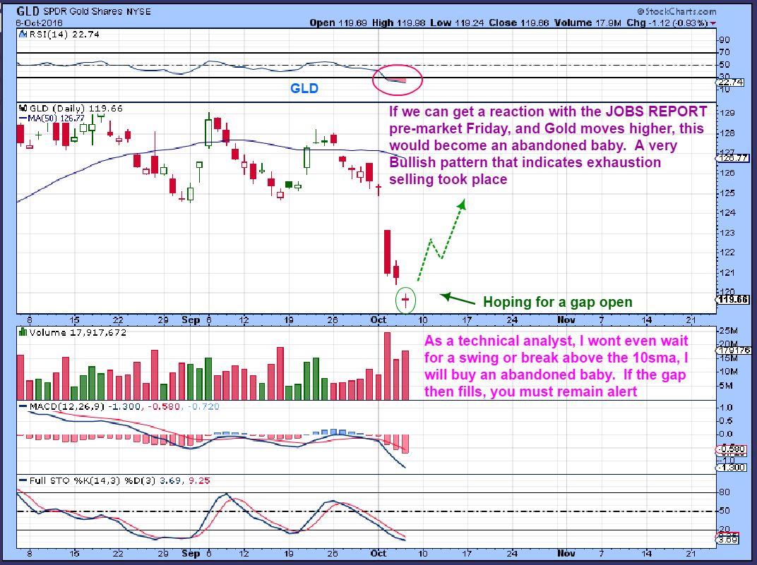 GLD–  As an active trader, a large gap open becomes a buy signal ( for Miners too – it would mean that Gold can run higher and Miners would likely follow).  HOWEVER – If that gap fills as the day goes on, the ‘abandoned baby’ is nullified. With the type of selling that we’ve seen, it would likely hold due to short covering on a Friday. Please read the chart.