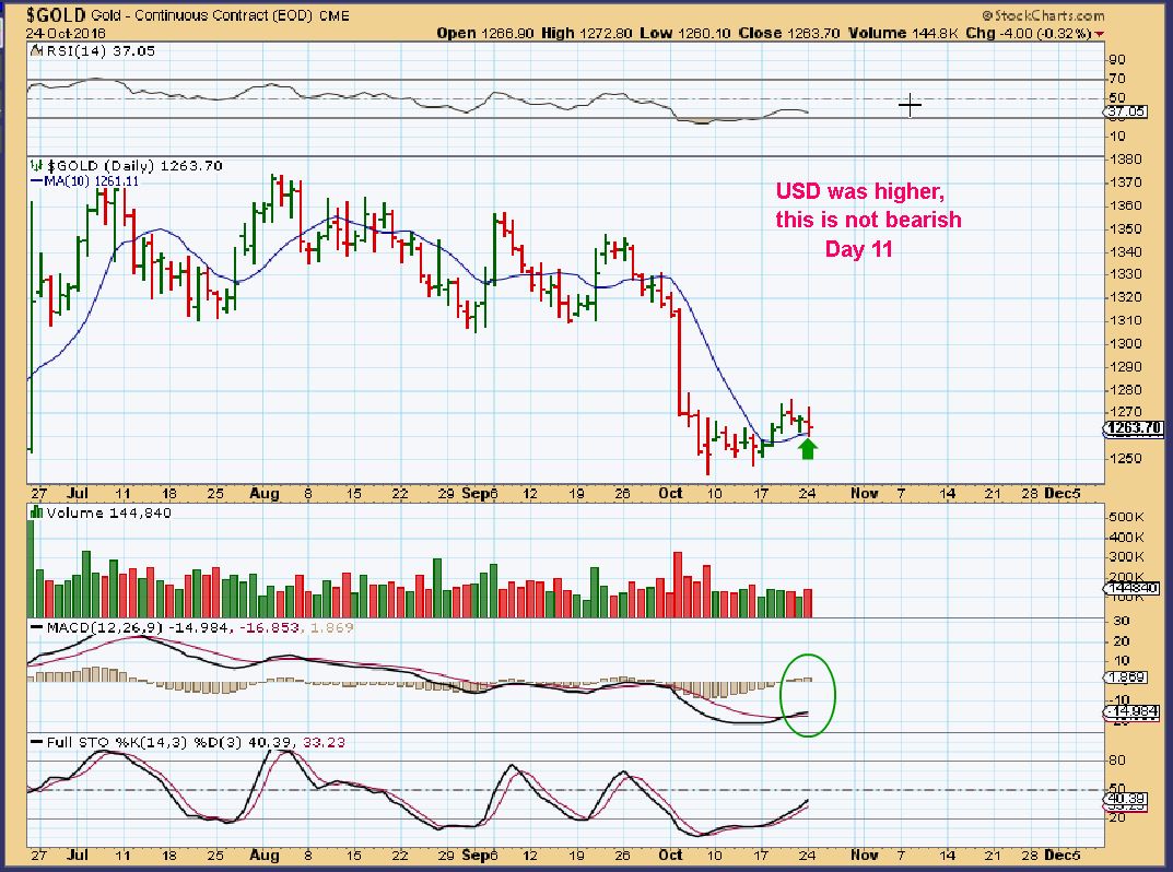 GDX back tested the 10sma on a 1 day dip and reversed back higher. It took back all of the losses from yesterday ( Unless you sold the dip, then you are out) Gold is moving higher ON DAY 12… it could put in new highs overnight, advancing the chances of this becoming a R.T Cycle…all of this while the USD was rising.