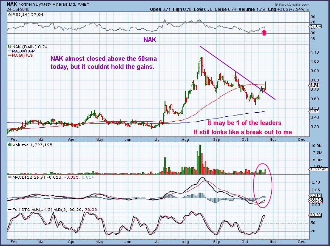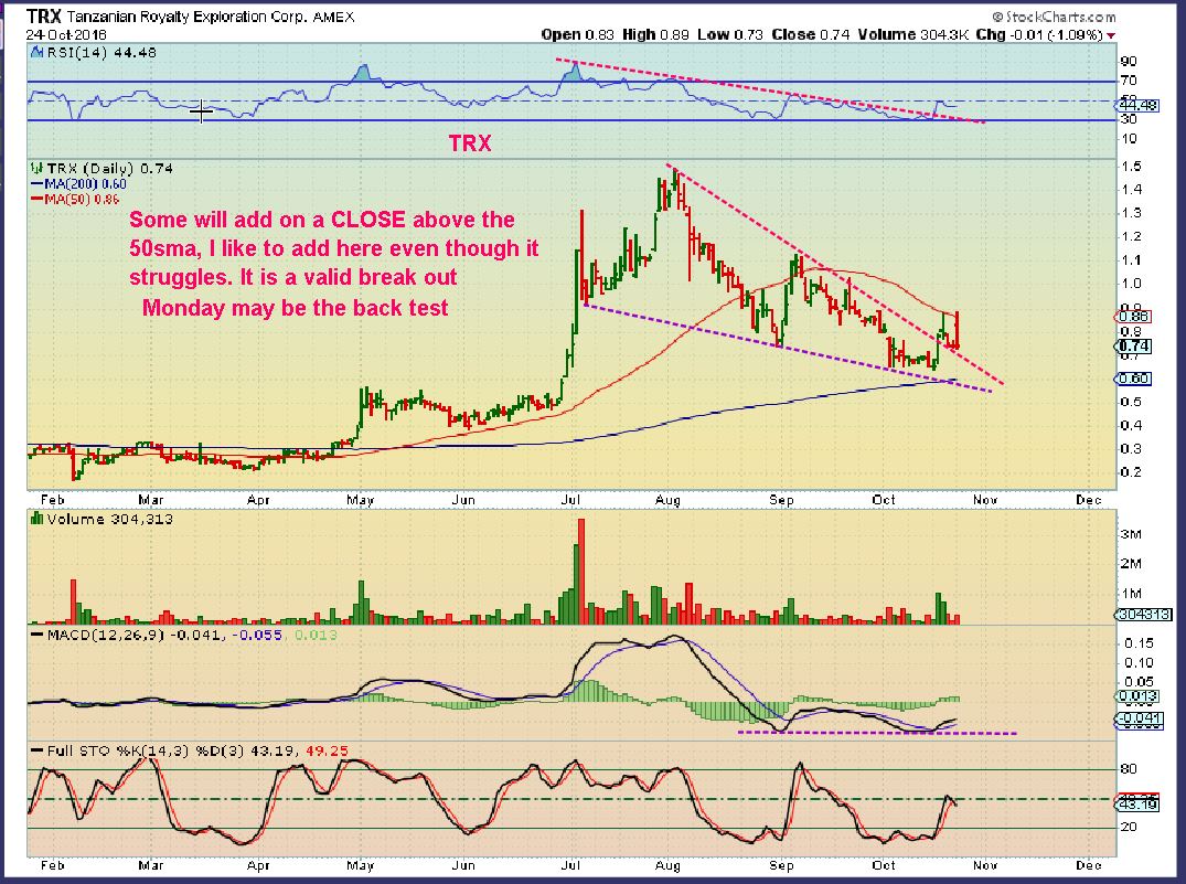 NAK –  I added to my positions again in NAK & TRX on their sell off Monday.  I have core positions and added at recent lows and now I can use a tighter stop for my newer additions if I am wrong.  A break back under the trend line and I would sell Mondays addition.