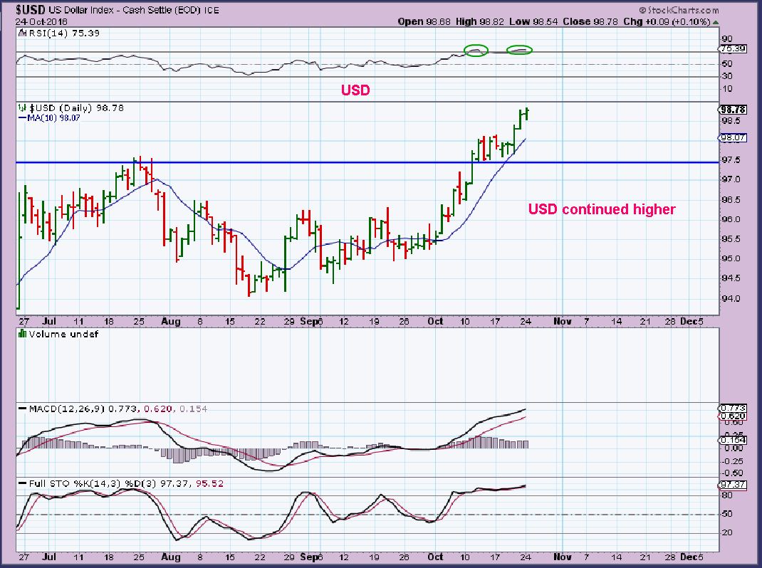 USD – The USD continues higher, but it is overdue for a DCL.  Technically it looks like it wants to continue a lot higher.  Can you believe that Gold & Miners have bottomed and moved higher over the last 11 days with this move?