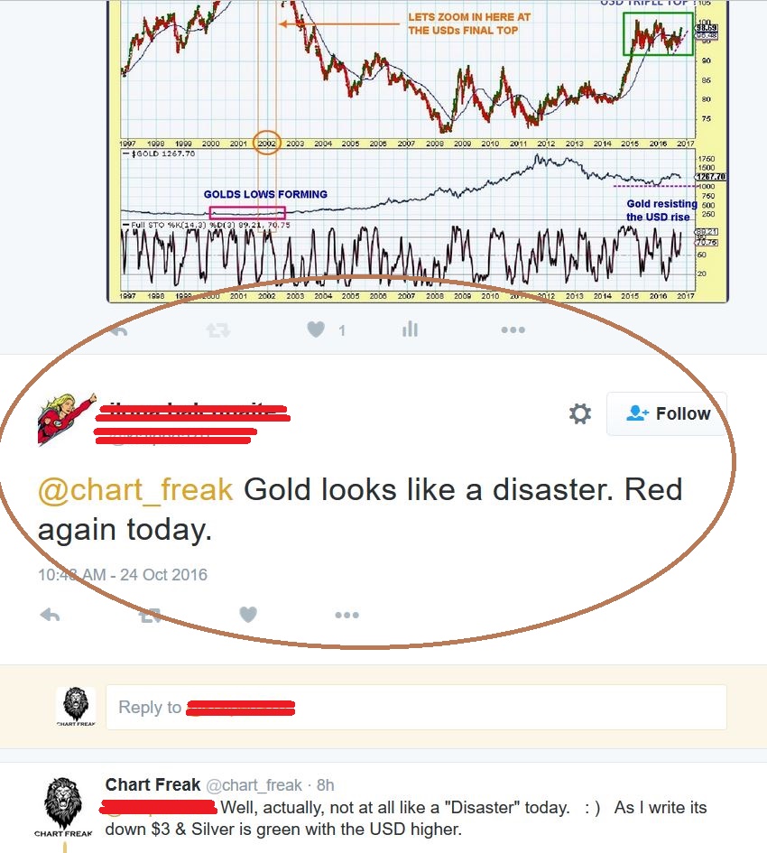 There was an overwhelming amount of bearishness in the twitter-sphere and even in our own Comments section.  I tweeted out a chart of the USG & GOLD from the weekend report and got this reply from someone that I do not know. She called Gold a disaster today.