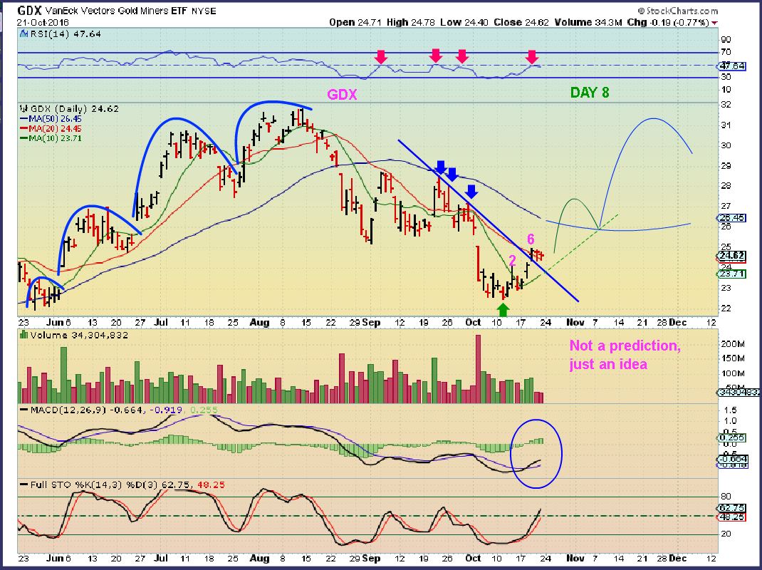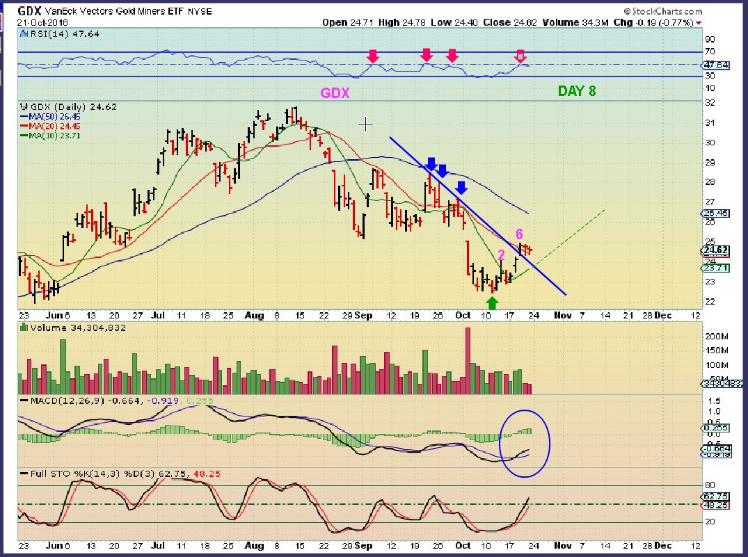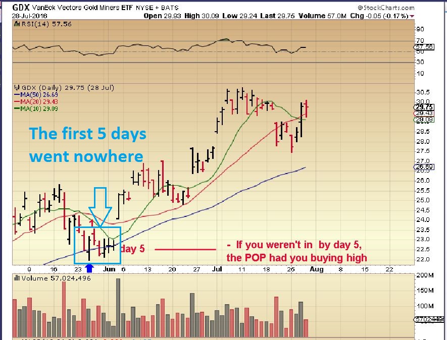 GDX – Notice how GDX moved higher to day 6 and then sideways on day 6,7,8,9,10. Day 11 it rocketed higher and never looked back.