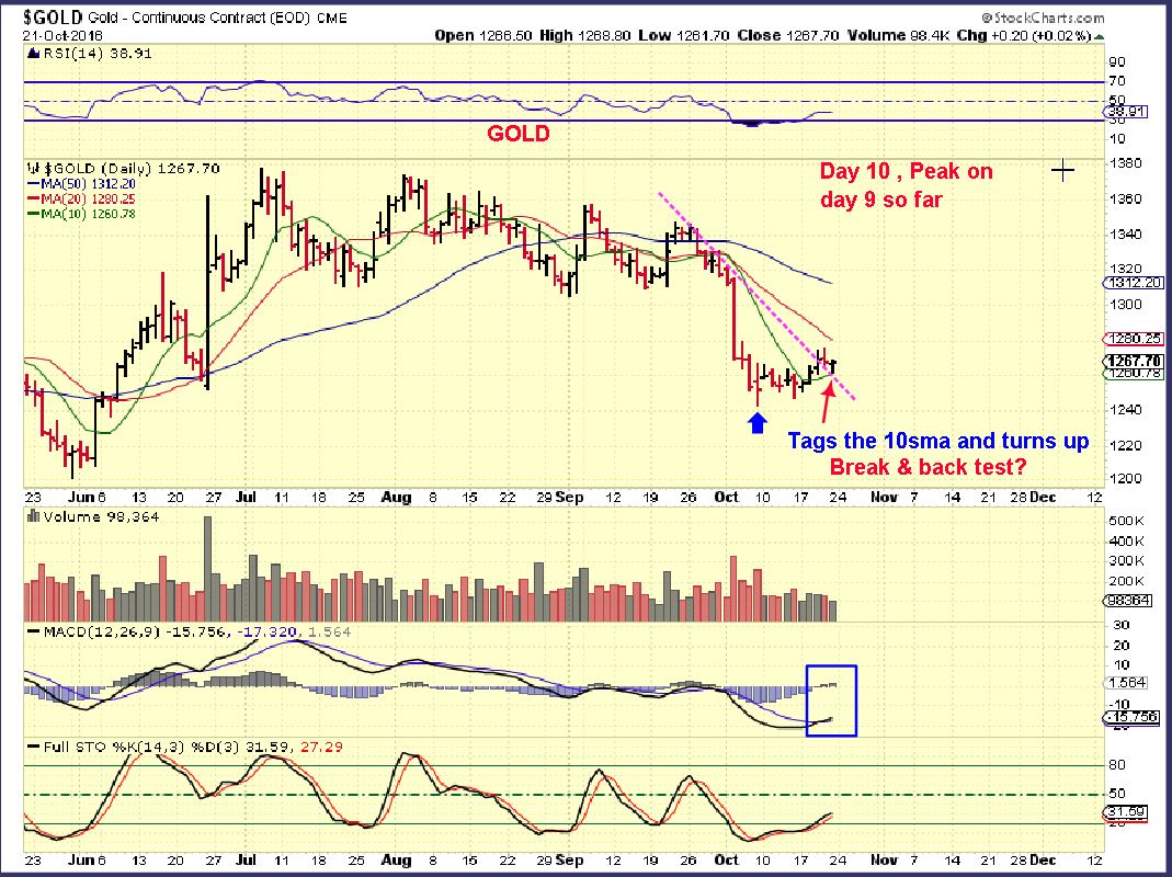 GOLD DAY 10 – Gold put in it’s swing low last week, so we expect an upside run. Miners seem to be leading. See Thursday or Fridays report again if necessary. GOLD tagged the 10sma area Friday near $1260.