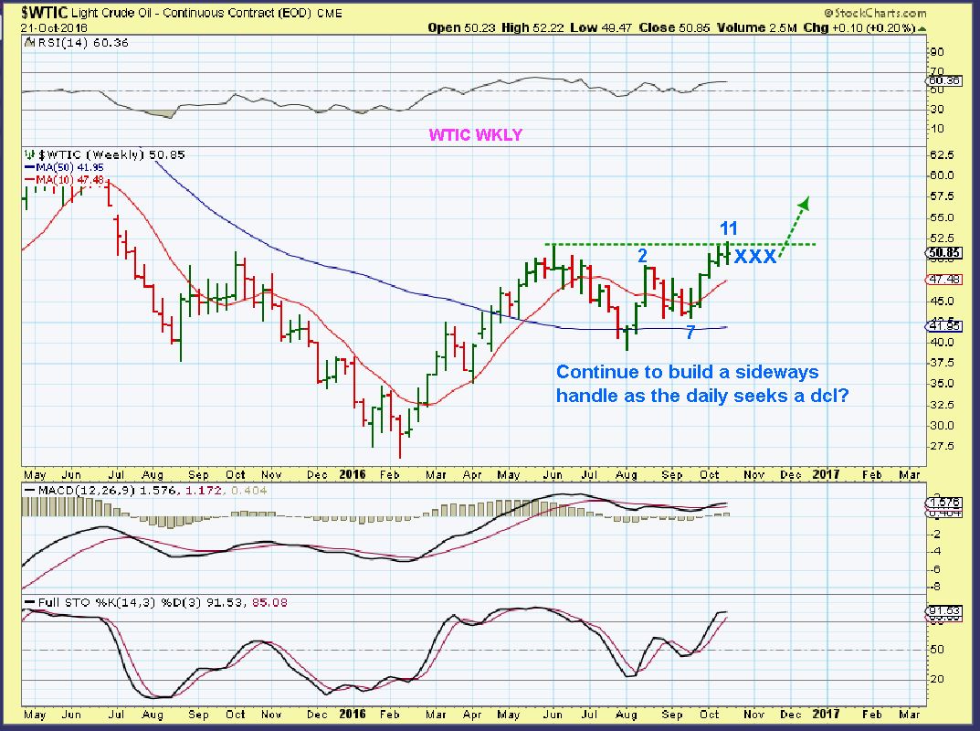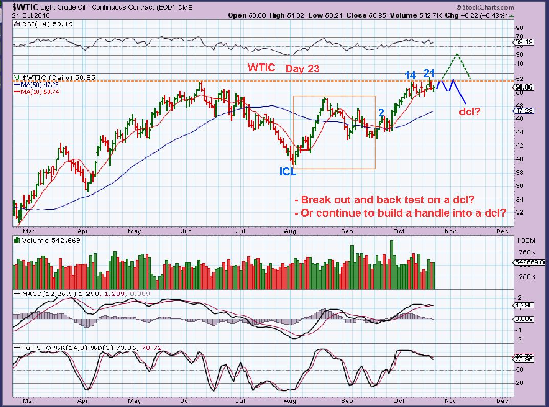 WTIC – I’ve mentioned how I felt that a handle would form on Oil, as Oil paused and struggled around the $50 area. We see that happening. A dcl can come from 30 days to 50, that leaves things somewhat vague until we see a break up or down.
