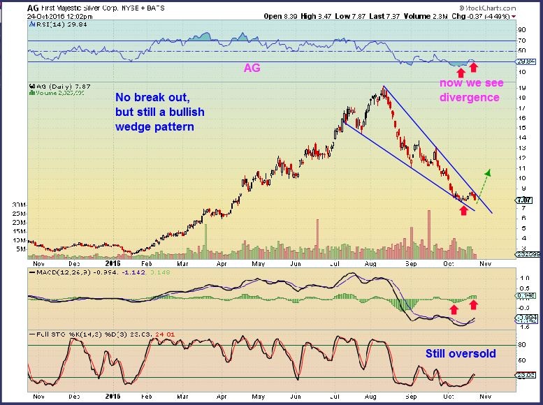 Ag is right back down near where I bought it,and I hate giving the recent gains back, but ( refresh) …That doesn;t mean it isn’t a bullish set up. I wouldnt want to see GDX back at the lows, but AG can actually break the lows and recover and still be fine : (