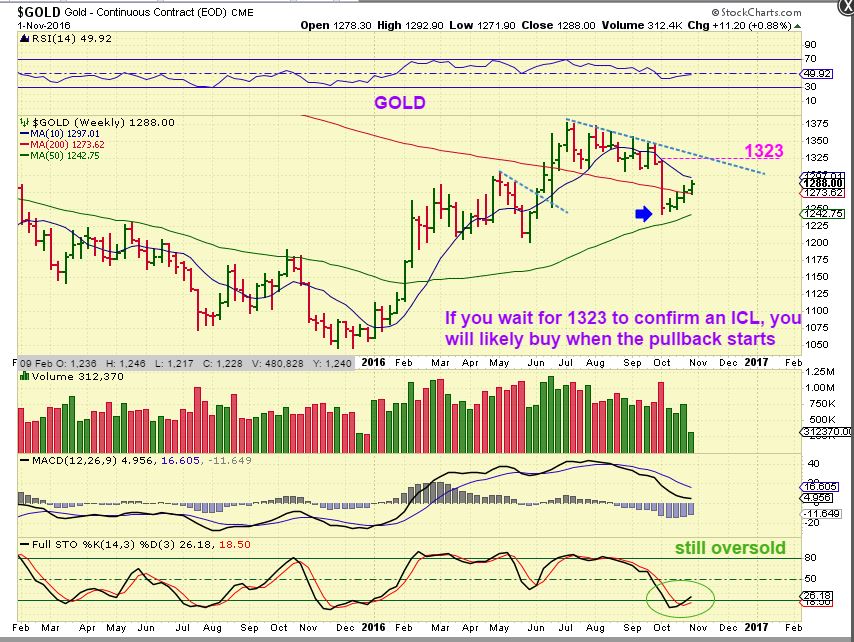 GOLD – Further confirmation of an ICL would be an overhead trendline break and a swing low on a weekly. Look at the 1 week drop of Oct 1st. Gold has to move above 1323 for that additional confirmation, but I have many other ‘signs’ that I use to find the lows. I called a possible ICL 4 weeks ago and a stop would have protected us if we had another daily cycle. 4 weeks higher and those lows have not been violated, yet it is still oversold .