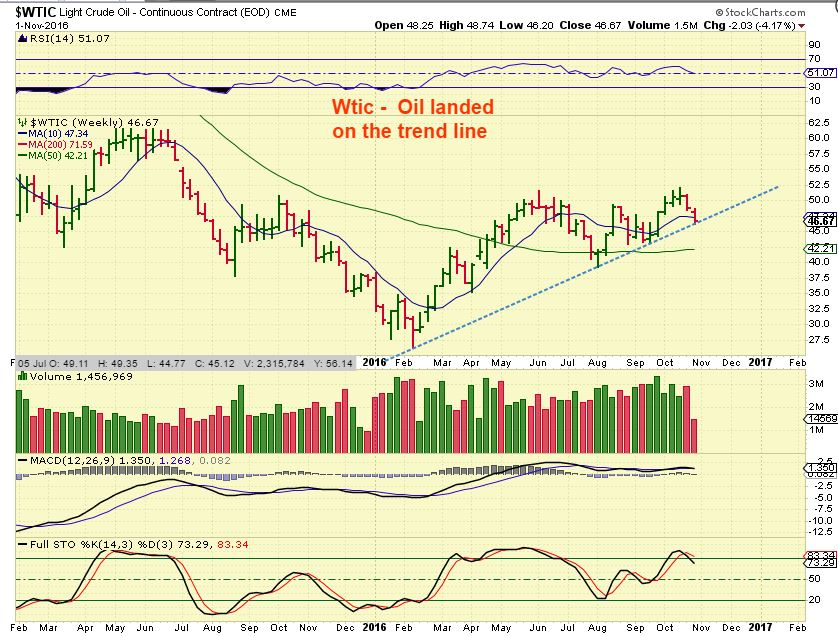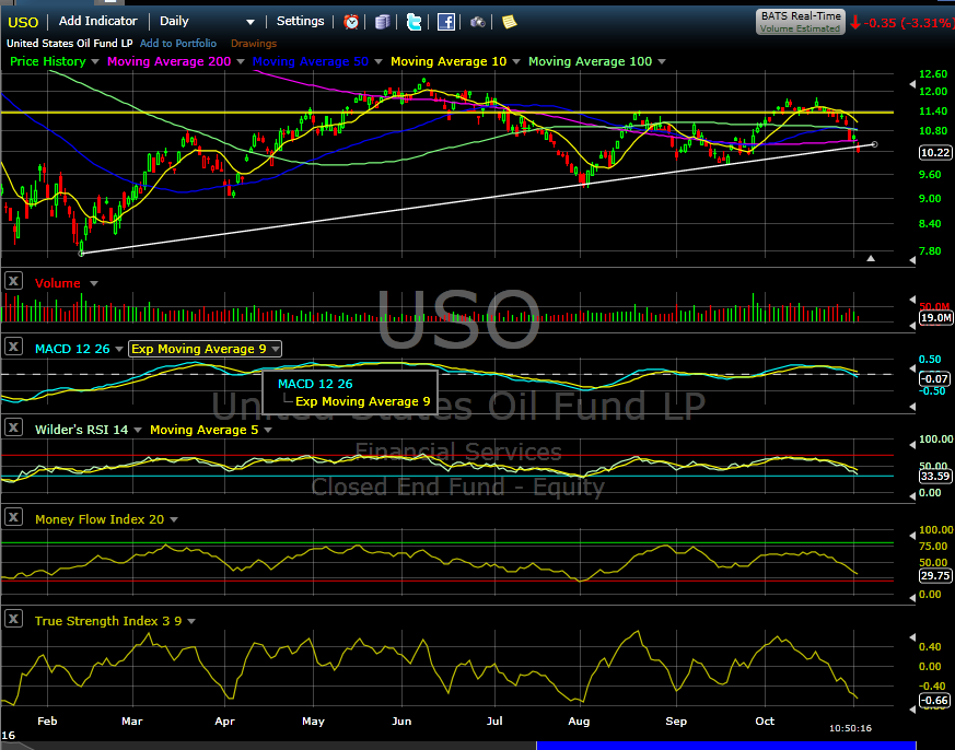 WTIC – It has held so far. Oil dropped right to the trend line and formed a doji candle ( a candle of indecision really) on high volume. We had a large volume day, yet no big price spread. Selling could be complete on day 30, but on Wednesday the Oil inventory is released. Stay tuned.