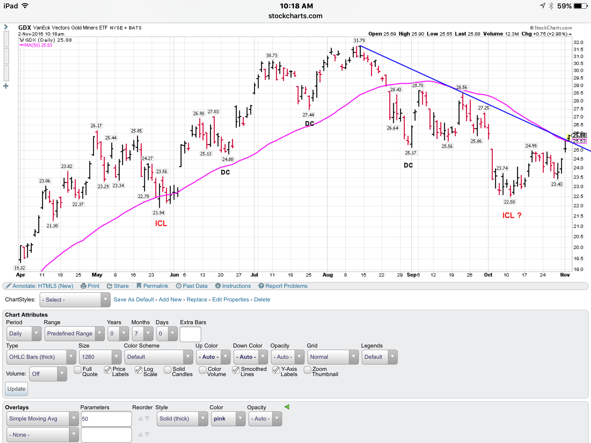 GDX Chart 1– A break through the 50sma with the Fed Mtg, and a dcl back test maybe next week.