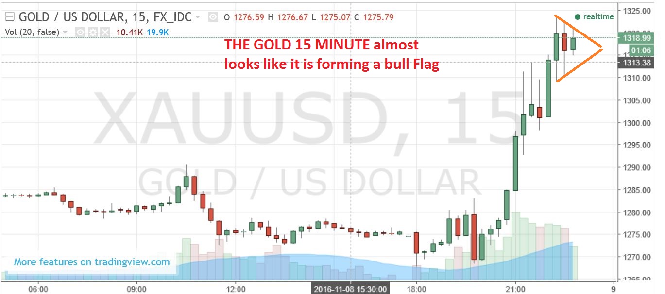 GOLD 15 minute – The election results are not final yet. This possible bull flag looks like GOLD could even propel higher if the results finish as they are currently being recorded ( a Trump win).