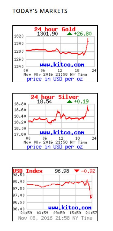 While counting the votes, TRUMP was taking the lead and it looked like he was winning key states. I looked up Gold , which was down about $1.00 one hour earlier, and GOLD reacted this way. Gold shot up $30 and Silver had already been climbing during the day. The USD dropped like a rock.