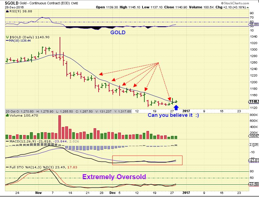 WENESDAY – Finally we see Our Break and close above the 10sma, and at this point, this is a Green light to buy. We want Gold to stay above $1140 now. This is so oversold, that this is likely to keep moving higher from here. I would expect this to be the ICL and the YCL, and thus it could run higher nicely from here into the 2017 new year. We shall see.