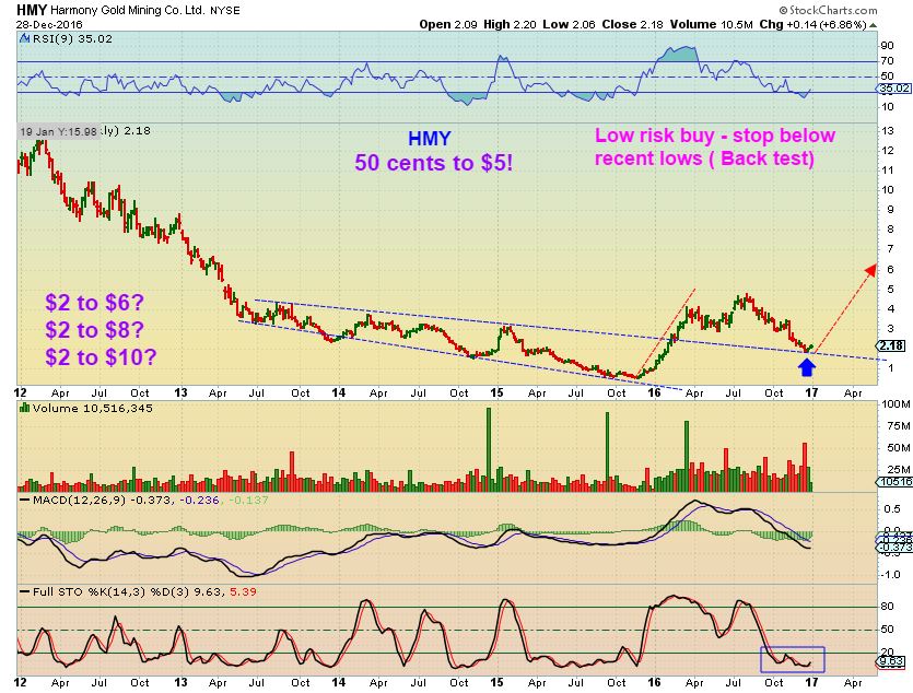HMY – HMY just moved about 20% off of its lows. The big picture looks like a possible back test of the break out last spring. HMY went from 50 cents to $5.00, and that is a Huge Run! At $2, this could double, triple, quadruple if Gold remains in a bull market.