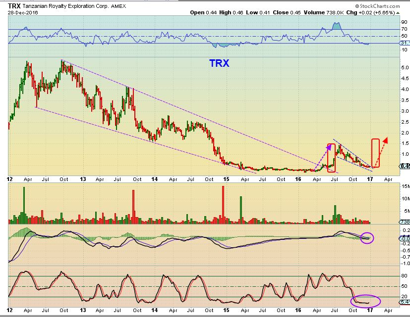 Looking at a 1 yr chart of VGZ , MUX, TRX, THM, and XRA – anyone taking those trades and riding them last spring did very well too. Also X, FCX, VALE, CLF, CENX, CDE, AG, etc . Add to that some of the energy trades, We had some really good runs in 2016. A traders paradise! I’d love to see us do that again in 2017.