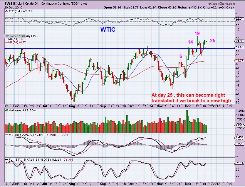 WTIC DEC 20th chart – Over a week ago on Dec 20, I was discussing this day 19 peak for Oil. I would like to see that peak taken out to lock in the likelihood of this becoming a right translated bullish daily cycle. Oil had experienced a break out.