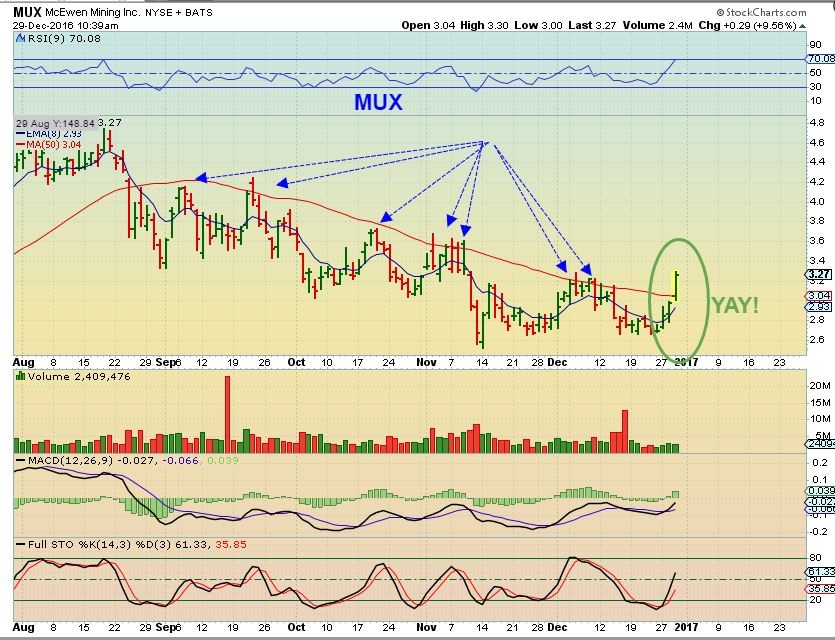 Assuming that you chart, slap a RelS chart vs. GDX (or GDXJ) on your screen. I am using a 3 ema on it. Check it out for many stocks. Of course, we want to have GDX positive. I had been holding AUMN for too long and sold a few days ago. I checked using the RelS and found I should have sold it using RelS alone, not any of my other indicators, on 12/8!!!! I didn’t – bad move. Today I got a buy alert on AUMN using one of my other indicators. I saw where RelS was weaker than GDX so I passed. I will buy only something that is stronger. Sure, laggards can work – no doubt. Not my game any more. I will miss many, but I am in this for the long run so I want RelS stocks. Now look at MUX. It got a RelS buy on 12/27 which was confirmed by my other indicators. I owned, but should have bought more. I am always learning. I call myself the Indicator Freak. Always looking for an edge. Instead of being in the hole, I would likely be green if I had used what I have learned in the last 6 months.