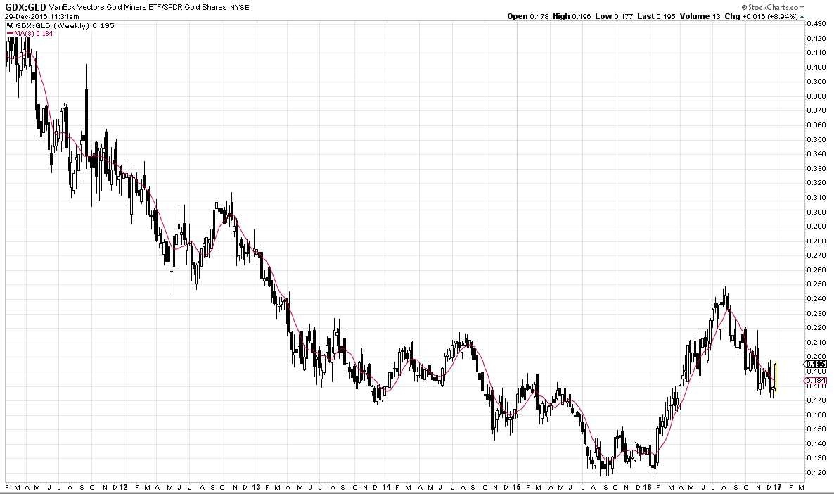 The SoG chart is a different animal. It shows that when GDX is stronger than GLD, it should be time to invest in gold stocks. Otherwise, we are likely to stay in a downtrend. I have posted his chart here. Double click on the chart to get a better looking chart. Good luck.