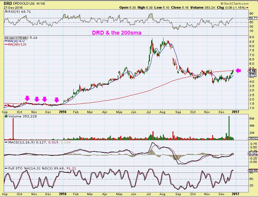 DRD hit the 200sma and turned lower. It may bounce between the 50sma and the 200sma, and then break out higher . I bought DRD last week and might add if it holds a the 50sma and this sector looks set to move higher.  My stop would be a bit below the 50sma.