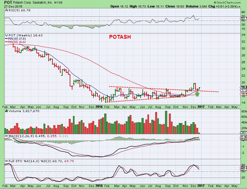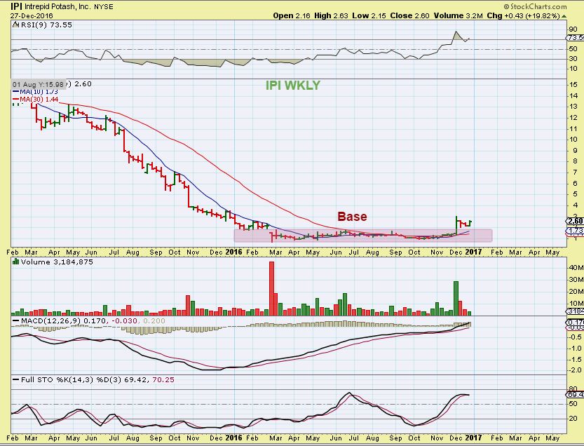 I’m watching some bullish set ups in Fertilizer areas. POT and IPI weekly charts are bullish, and look set up to be so for the longer term traders.   If a sector remains bullish, these bases can push price back to former highs over time, as we saw last spring in the MINERS.