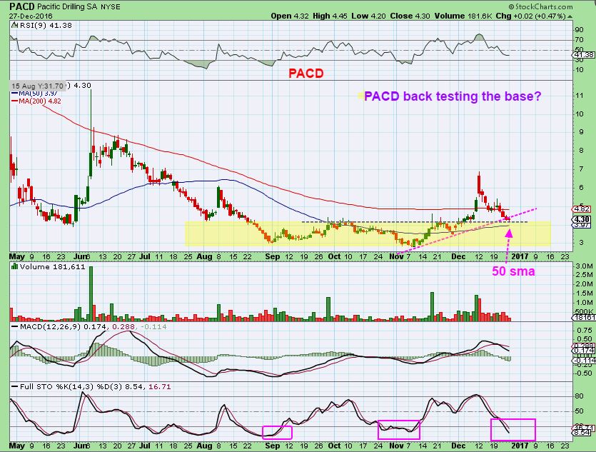PACD – PACD has been drifting lower daily and it also may be back testing a break out from the base and the 50sma. It looks healthy, but I sold it and I ended up selling at a small loss, simply because I do not like to hold more than 5-10 stocks at a time, and I bought a few other areas.  I will explain later.