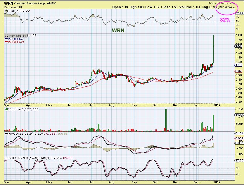 WRN – That sideways move built up the energy needed to break out and the volume was perfect ( on a light volume holiday week of trading) . It popped up 32% yesterday.  I sold 1/4 of my shares, because I often take some money on these pops , before they can take it back.  I also always let some ride, in case it just gets crazy.  So if I had 10,000 shares, I’d sell 2,500.  If I had 6000 shares, I would sell 2000, etc.   That is just my trading style.
