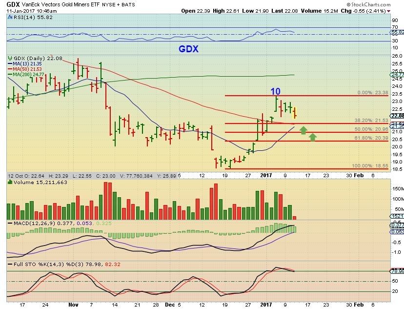 This was GDX at 10:45 a.m. – I was pointing out that even though GDX was dropping, it is a bullish pull back so far, possibly targeting the 38 or 50% level and the 50sma. I have had a few readers tell me that they sold every Miner position and that they do not like this dip. This is very bullish, not even 38% yet.