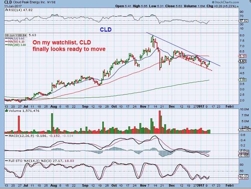 CLD – This one ran very strongly from June to November from $2 to $8! After a rapid high volume decline, it now may have double bottomed. I’d wait for a sign of strength first – a break of the blue downtrend line or even the 50sma. ( Watch list).