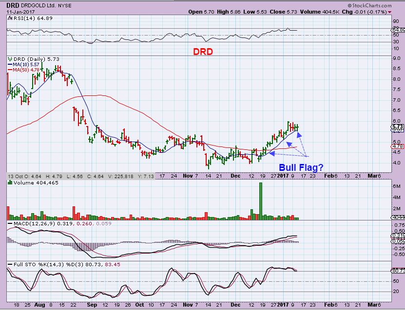 DRD – Riding the 10 sma, forming a possible bull flag this week.