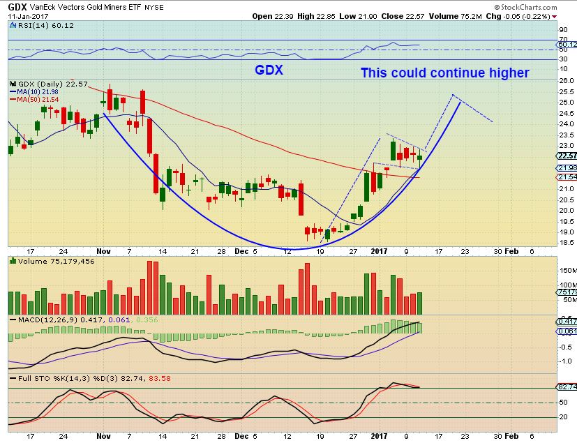 GDX – Then GDX reversed later that day and bounced off of the 10sma area. ** Note : This could continue higher and if it finishes a cup in this first daily cycle, anyone that sold will have to buy higher in a handle. A sideways consolidation may be the dcl ( Bull flag). Also we may break Gold 1200 and then fail, dropping into a dcl. We will have to wait and see, but I’m not selling out at this point.