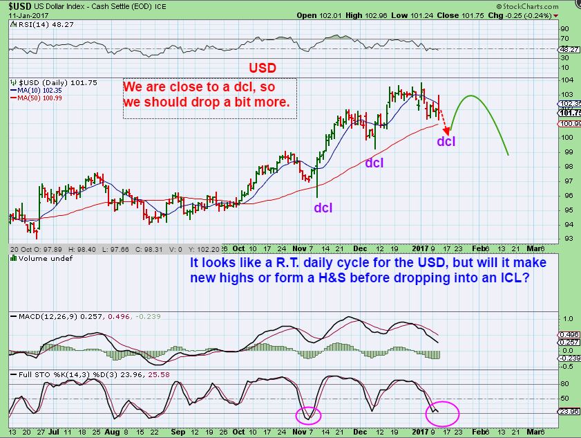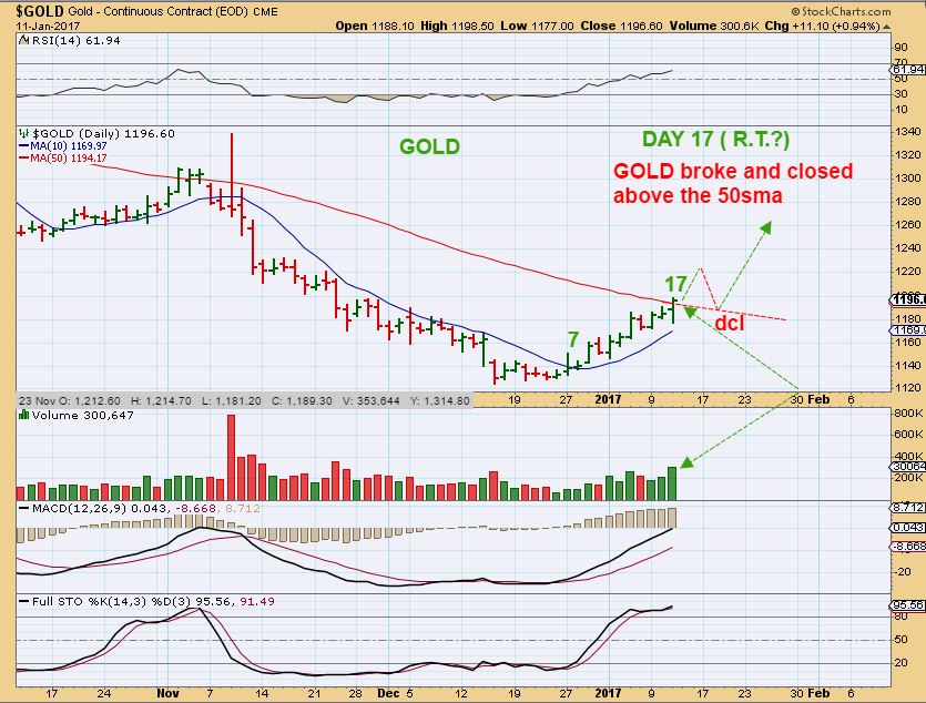 GOLD – Gold actually broke above the 50sma and closed there. 🙂 A drop in the USD could push Gold even higher over the 50 sma, and then the dcl could be the back test as drawn in the report yesterday. A Wednesday Day 17 high is also bullish, Thursday is day 18. Gold can also break 1200, and roll over as a quick break out / fake out. You may want to go back and read the report posted last week entitled “Do Not Get Too Cute”. If Gold just keeps rising to complete this cup, many will get left behind, similar to Jan – march 2016. At Chartfreak, we did NOT get left behind. 🙂