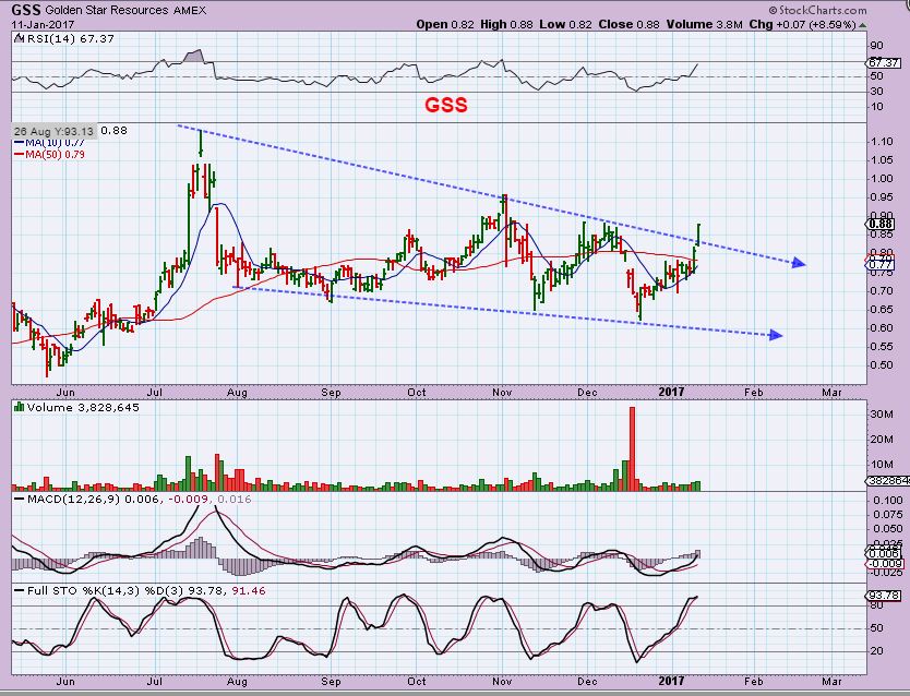 GSS – Breaking out and this was happening while Gold was down. This is forming a long frying pan and should go above $1 soon.