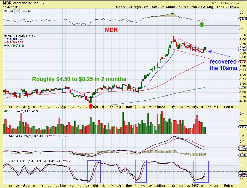 MDR – I have a list of set ups that I’ve been watching, and this one broke Wednesday. It pretty much doubled in October and November and then consolidated those gains. It looks like it wants to try to run higher again after a reversal candle 3 days ago.