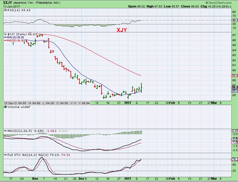 XJY – The yen looks to be bottoming and bullish too. This is bullish for Gold. Can the Yen make it to the 50sma?