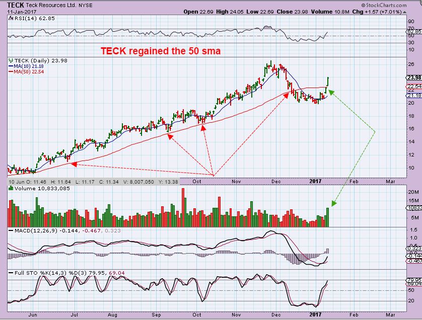 GGB – I was watching this one and didn’t think that it would break out above the blue line yet. It certainly did on Wednesday. Look at how this ran in the spring and from Sept to Nov. It looks ready to go again.