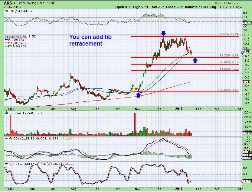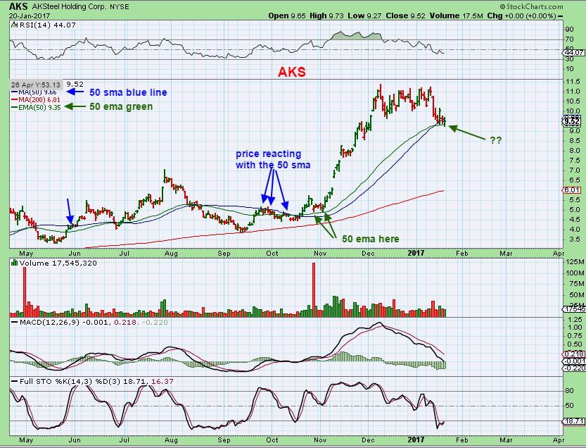 I am mentioning this because with the recent market selling, some of the buy set ups in X, CLF, ( Especially AKS) and so on are dipping below the 50sma. Since the market was down today, these are not recovering the 50sma, so they need watching. As of Friday, I captured these charts for this part of the report.