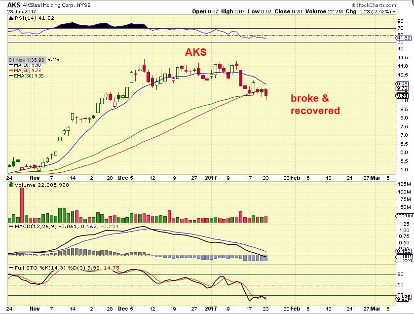 AKS – In the report as one that dipped below the 50sma. It was up $1 in pre-market after earnings. THAT recovery of the 50sma is likely a buy if it doesnt sell off back under the 50. Earnings must have been good