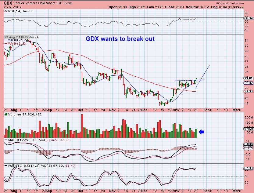I also discussed a pattern in GDX in the weekend report. It does look to be breaking out higher too. We will look for follow through, and many traders but this with a stop a bit below the pattern. A dip to the 50sma could happen if we slip into a dcl. This looks like it wants to go higher though.
