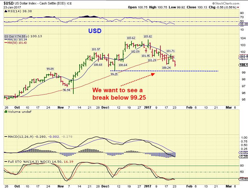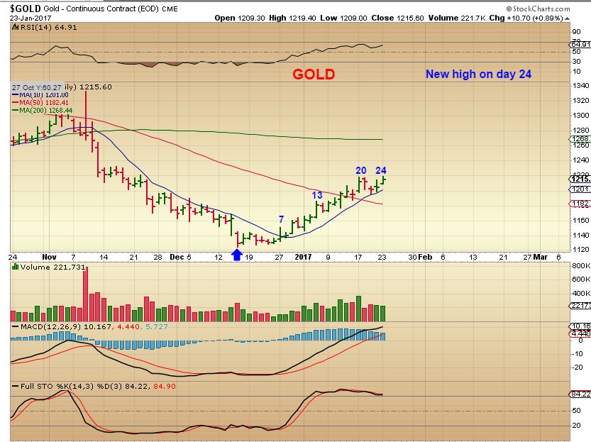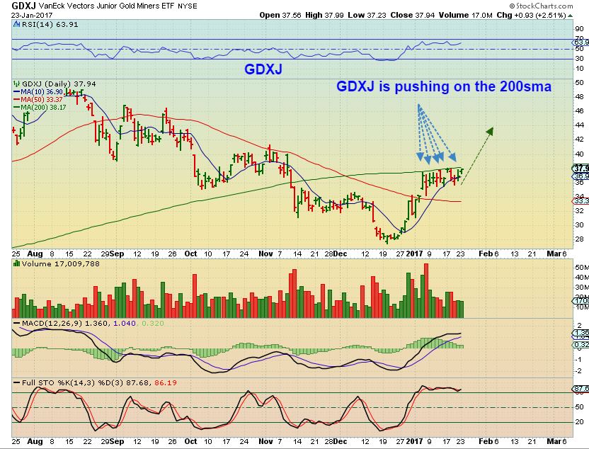 As I posted here, I bot JNUG and GDXJ on the dip last Thursday (Jan 19). I mentioned then that the dip to the 13 day SMA looked like a good buying opp to me. I thought that MIGHT be as low as miners would go based on my charts and Alex’s theory that miners might keep creeping up like they did in January 2016. So far, so good.