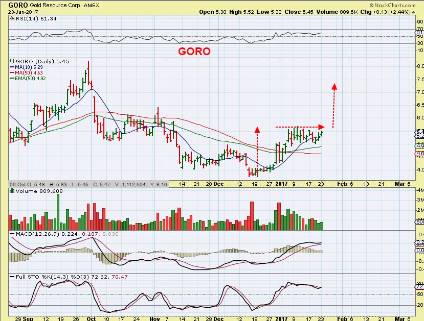 In conclusion: So we see a repetitive pattern forming in the Miners, and now several are breaking out. I view this as Bullish and would expect others to follow. Many miners had a nice run higher from Dec into January and a consolidation sideways ( including GDX & GDXJ), and we are starting to see some Miners breaking out. This gives us the hope that many others will follow, since these are often continuation patterns.