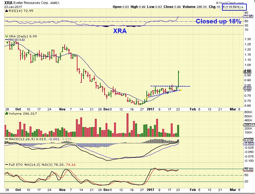 XRA – Huge push higher on excellent volume. Did you notice that XRA has not really done very much since December? If you own a lagger, there is the hope that it may just break out when Gold moves higher too.