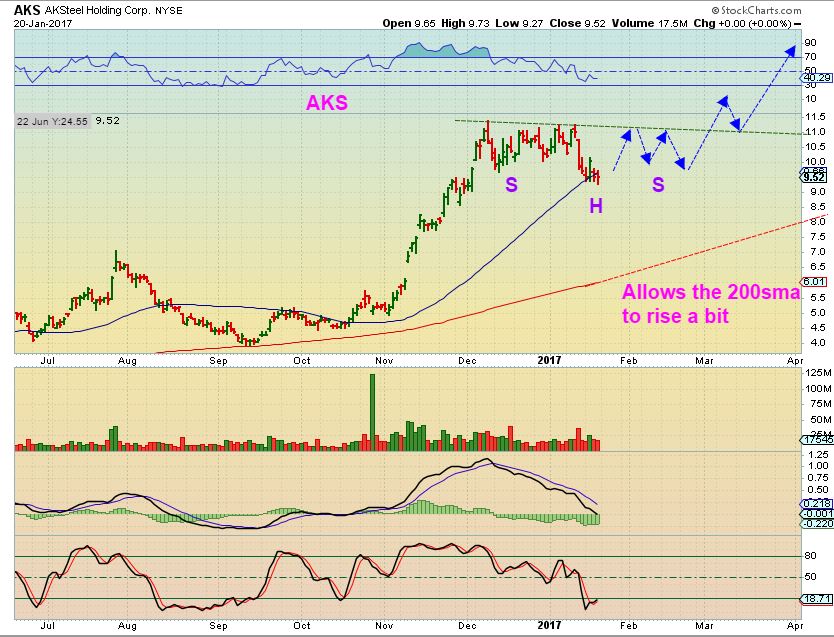 AKS – They may just dip more than we expected and still remain bullish. I can picture them forming an inverse H&S after a shake out, for example.