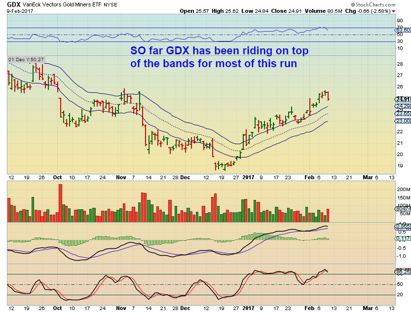 Your chart on GDX, “GDX has been riding the top of the bands” what type of bands are those? They don’t look like Bollinger bands. What is the name of the indicator on stock charts?