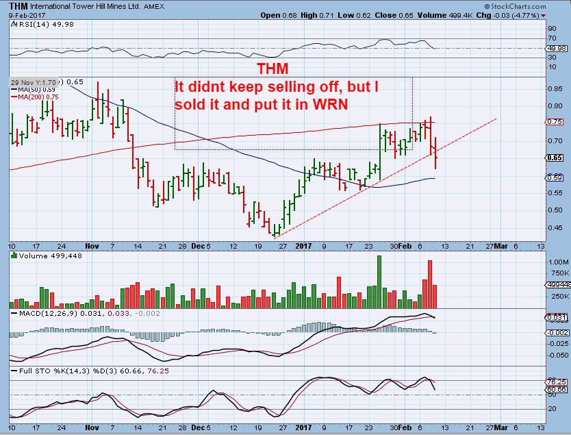 THM – I mentioned that I sold 1/2 and put it in WRN Wednesday. I also said that I would probably sell on a break of this uptrend, that was my line in the sand. This recovered a bit and may be fine, it could even drop to the 50sma and then move higher. as for me, I sold the rest and went into WRN again. If I see a break out above the 200sma, I will re-buy it there later.