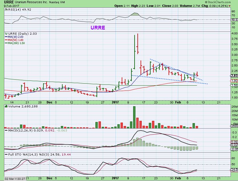 URRE WEEKLY – Weekly charts may not play out “the next day”, but I love this set up longer term. We bought URRE around $ 1.40 – $1.60 late Dec and early January. After a huge run, I sold all of mine at more than 100% gains. Now we see a consolidation and I want to buy & hold for a while, and this looks like good support and an excellent base.