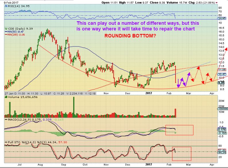 CDE Closed at the lows on HIGH volume selling. No buyers wanted to come in at those prices. It would seem that Shorts didn’t cover either. Also the drop was due to their earnings report, not a rumor from an outside source. The buyers would probably need to see something encouraging other than “the price just got a lot cheaper’. There is always the idea that future selling may continue . FUNDS often sell in increments. That will take time and the chart needs repair work first.