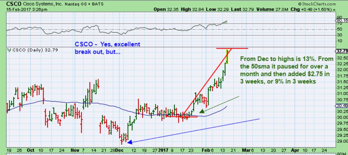 CSCO – ON FIRE? YES! Look at that break out and run higher. However this rip higher is 13% in 2 months from Dec to now. $29 to $32.79 ( GDXJ was $18.50 to $25.50 – GG above was $12 to $17). You are invested in the right sector at this point. Perspective is everything.