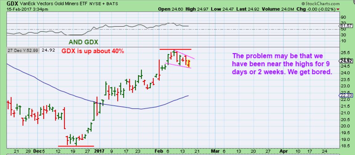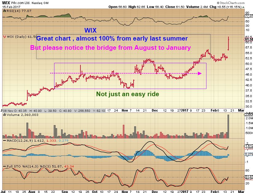 WIX – A great run, almost 100% from early last summer, but was it an easy ride? No. Could you have held on from August to January with 6 months of sideways before yesterdays POP. GDX has only had 7 days of sideways 🙂