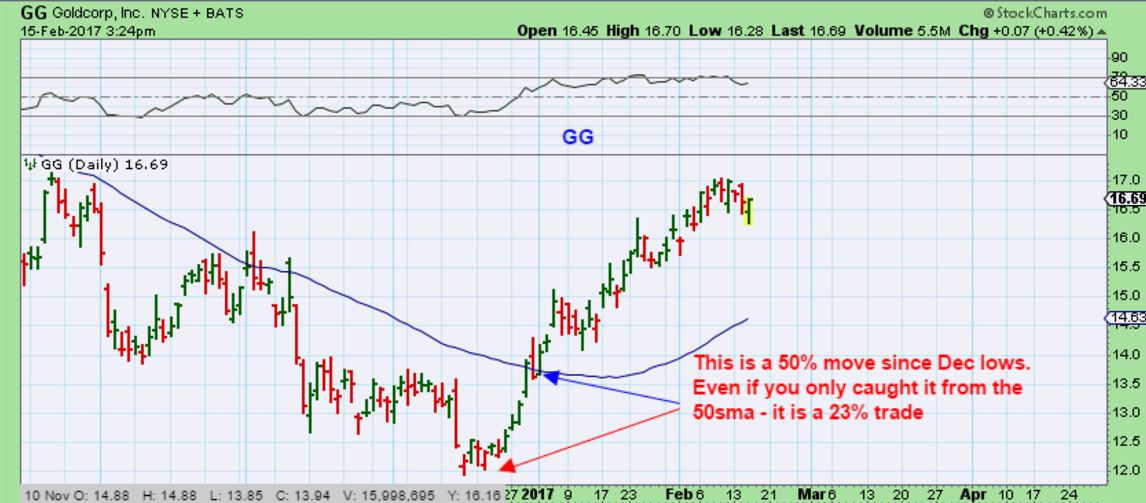 GG – Even GG ran 50% from Dec, and if you caught it after it gained the 50sma to be safe, you have 23% and a reversal Wednesday at the highs.