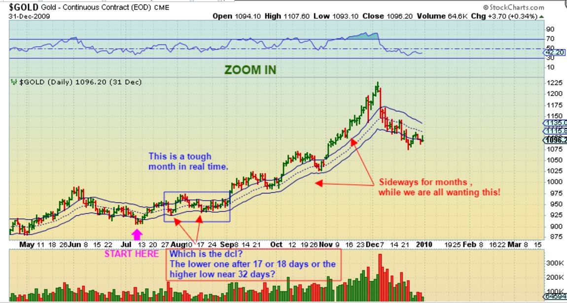 GOLD 2009 ZOOMED IN– Look at the blue box out of the July lows. That looks confusing cycle wise. Where was the DCL? Tough call, and although there was nothing ugly or bearish or weak in this run, it could have looked weak at that point. For inexperienced traders. this is a sideways Bridge building period before an explosive run higher. Again, look at that tough 2 months in the blue box, and then look at the rally for the following months. I say this because some are possibly confusing consolidation for weakness.