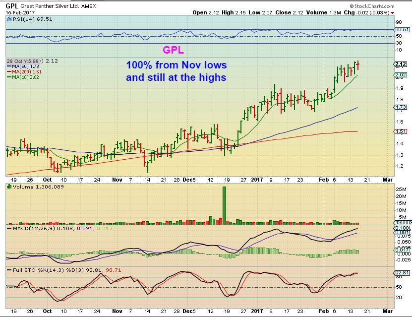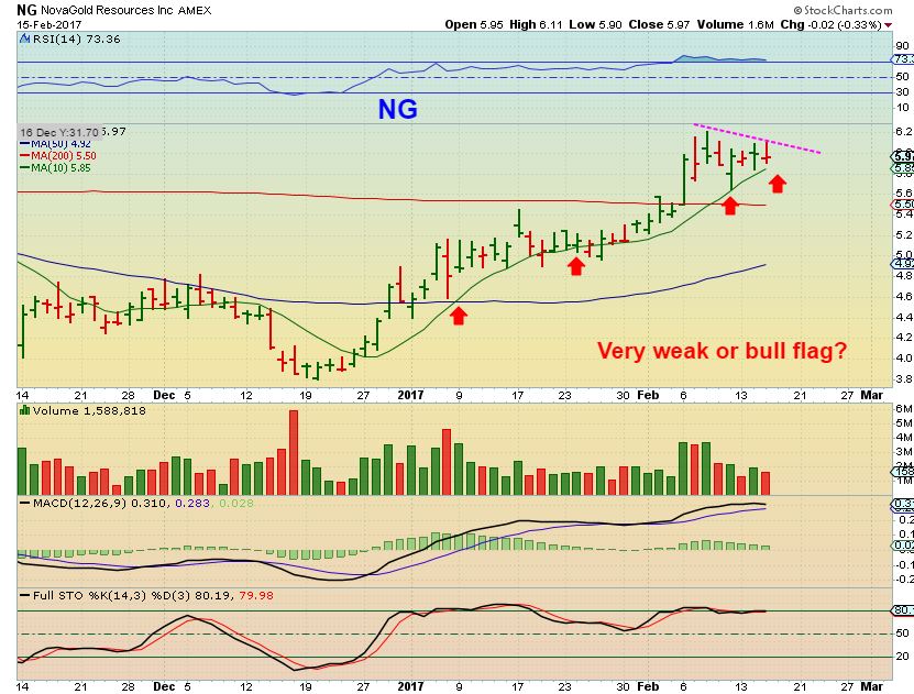 I will put a couple in the report tomorrow, that look set up to go higher. For example : EGO, SAND, EXK, BTG, HMY, they look like they want to move higher. They are not extended, have bull flagged a bit , they just need a push.